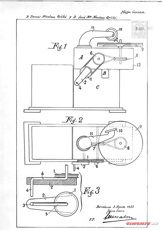 2 años más tarde se patenta el SUPLEMENTO SONORO . Basicamente se trata de un pequeño gramófono que se acopla en la parte superior del proyector; en la manivela de este se ha situado una rueda dentada que permite que gire el disco simultaneamente al desplazamiento de la película. La sincronización... pues eso: ajuste analógico XD