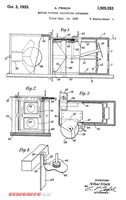 Sobre las mismas fechas aparece el Movie-Jektor, del que podeis ver la patente del "inventor" Arthur Frisch y que es una copia descarada del mecanismo del NIC, pero que "coló" en la Unitaed States Patent Office