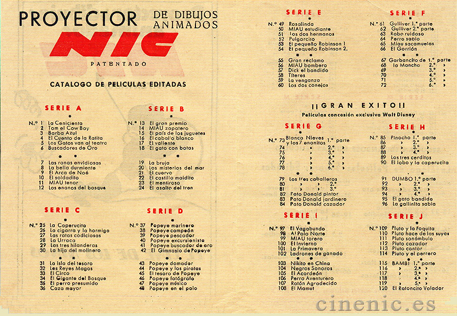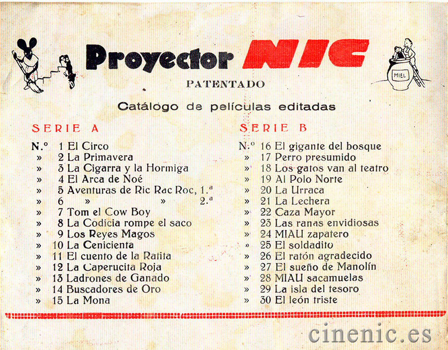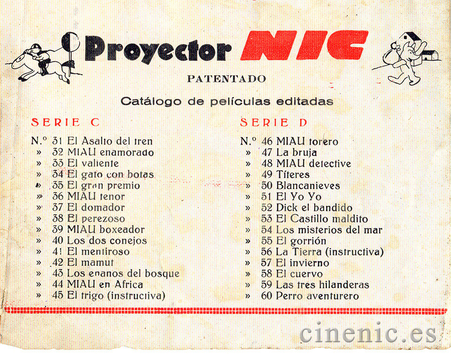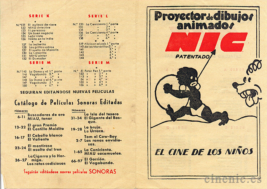 Las primeras películas que se dibujaron para el cine NIC se basaron en muchos casos en historias propias, como por ejemplo "El Circo", "La primavera", "Las ranas envidiosas"... En otros casos sobre personajes de nueva creacón como Nikito, Tom el Cowboy o Miau (de clara inspiración en el gato Felix, muy popular en los años 20/30). También se dibujaron peliculas sobre fábulas "La cigarra y la hormiga" o "Los dos hermanos", así como sobre cuentos populares "Rosalinda", "El gato con botas", "El mentiroso"...